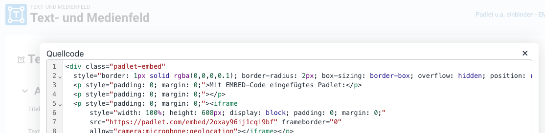 Den hier kopierten EMBED Code fügt man in der Moodle Aktivität Text- und Medienfeld (s.o.) ein: