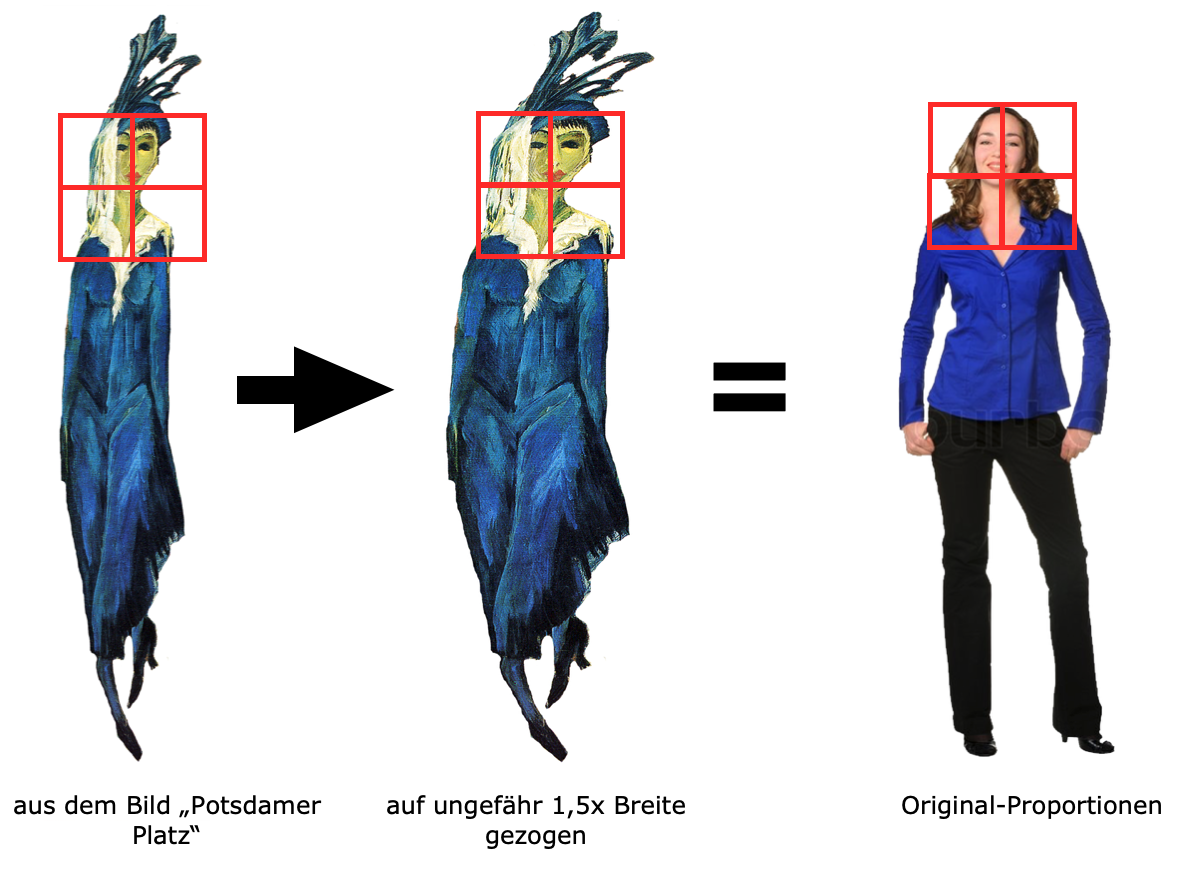 Abgeleitet von Proportionen in der Natur werden hier Verhältnisse von Bildteilen zueinander bestimmt. Dies kann sich auf Größenverhältnisse von Bildgegenständen zueinander beziehen, hier wird aber die Aufteilung der Bildfläche betrachtet. Eine vereinfachte Relation der Teile zueinander lässt sich mit 2 zu 3 beschreiben. Das DIN A4 Papier entspricht ungefähr diesem Verhältnis. Da wir diese Proportionen sehr häufig - unbewusst - sehen, wirken sie auf uns normal bzw. "schön".