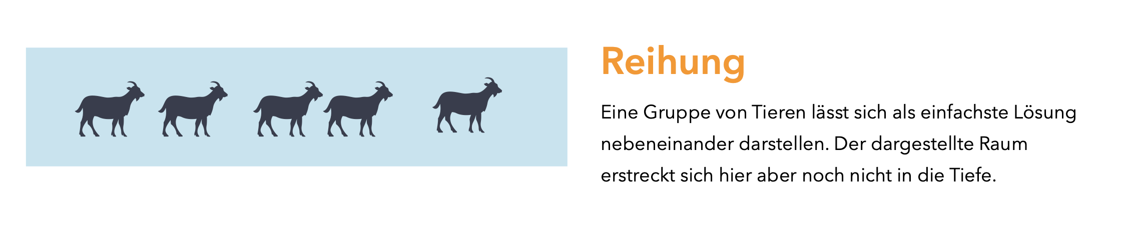 Eine Aufreihung von Bildobjekten nebeneinander zeigt ihre gleichmäßige Wertung. Sie werden zur Begutachtung nebeneinander präsentiert. Dies vermittelt oft eine ruhige Wirkung.