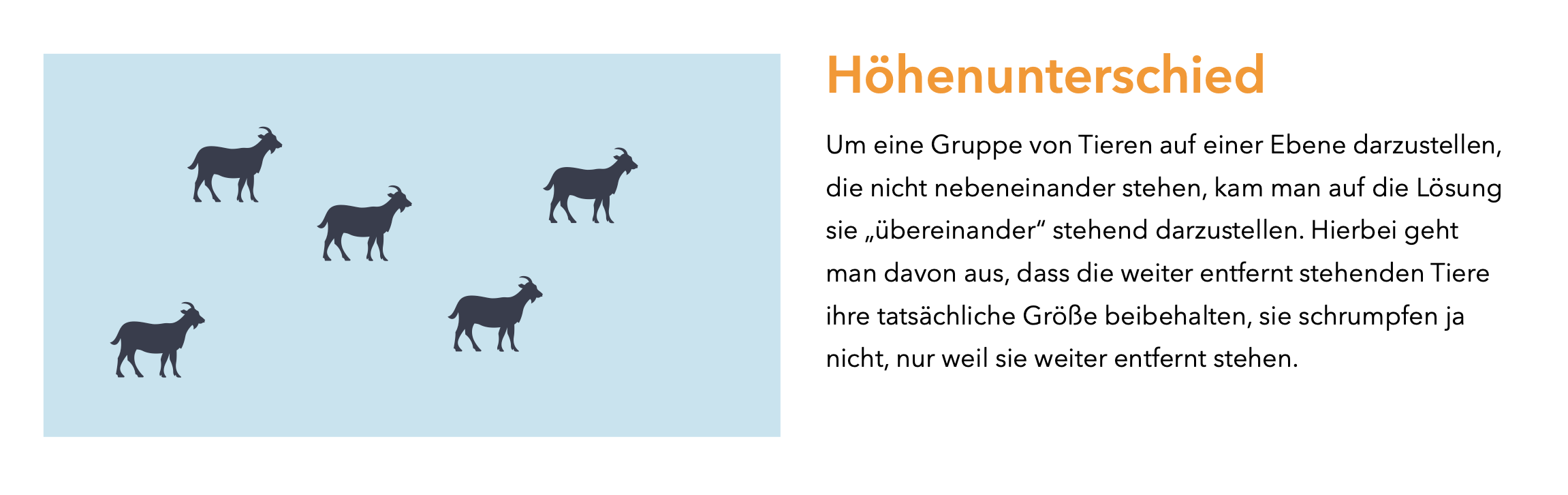 Die Horizontlinie definiert die Augenhöhe des Betrachters. Alle anderen Personen im Bild, deren Augen sich ebenfalls auf der Horizontlinie befinden, stehen auf der gemeinsamen Fläche. Abweichende Höhenlagen der Augen bedeuten dann eine erhöhte oder vertiefte Position in Relation zum Betrachter.