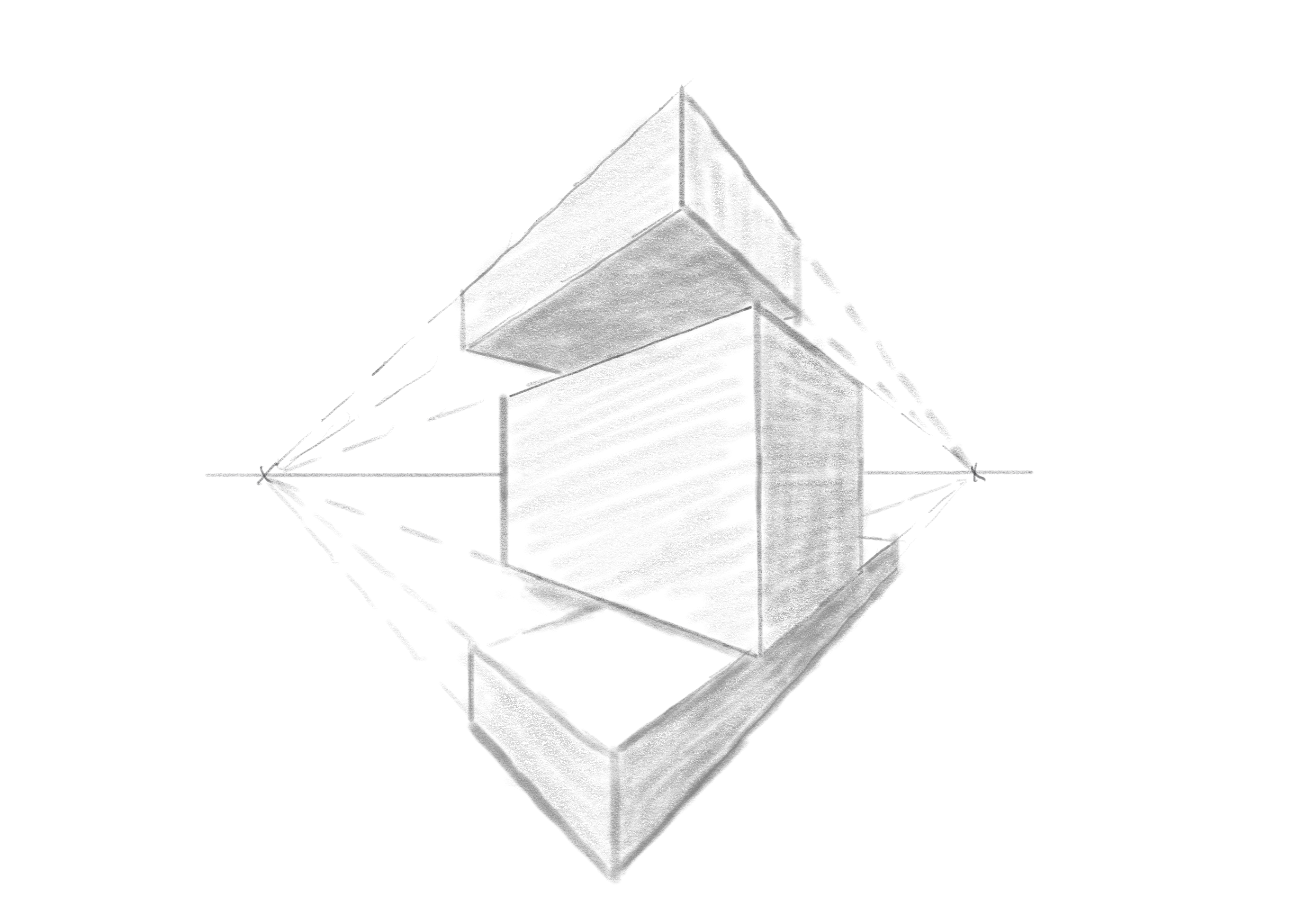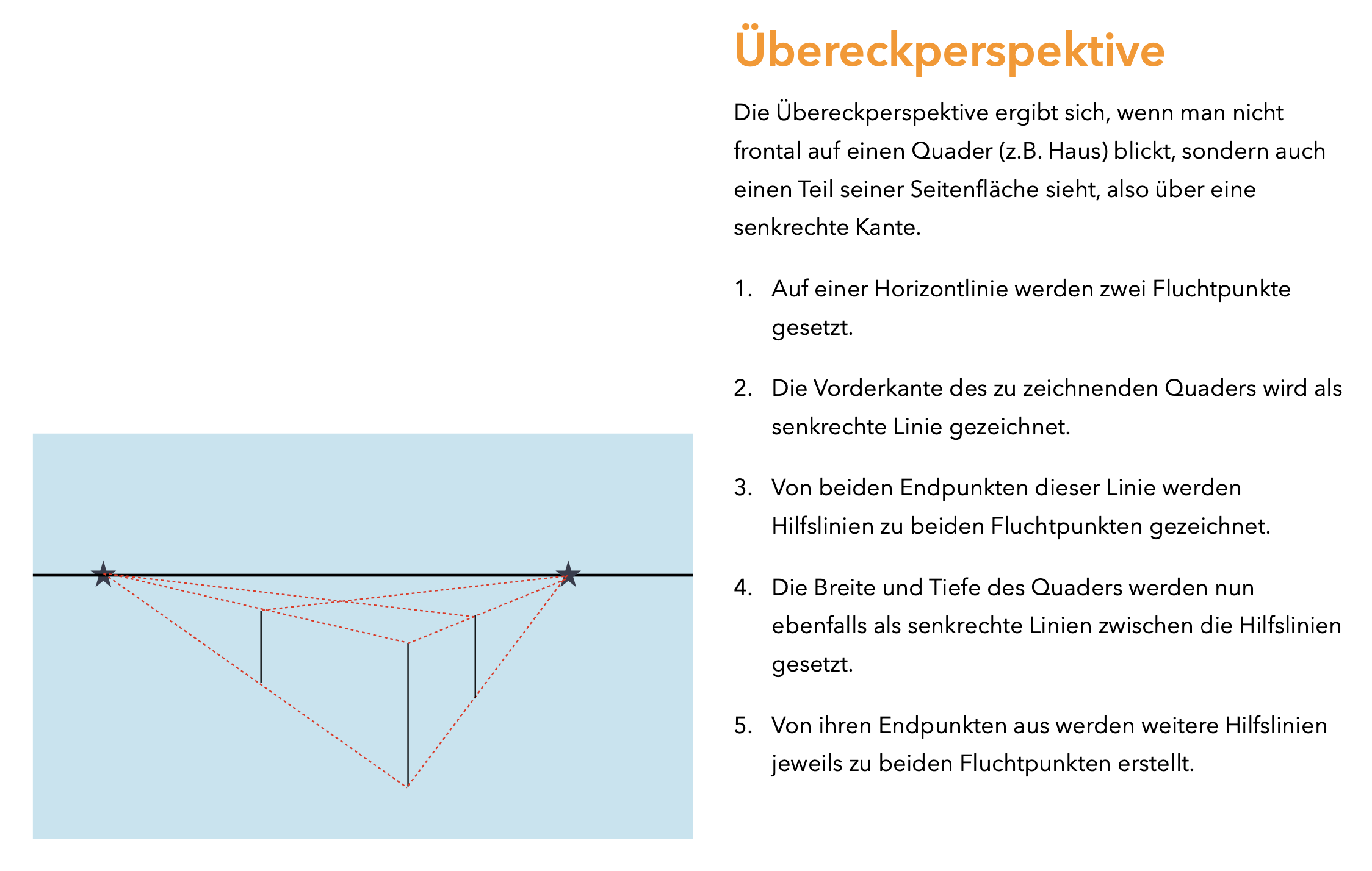 • Zeichne die Horizontlinie und setze zwei Fluchtpunkte