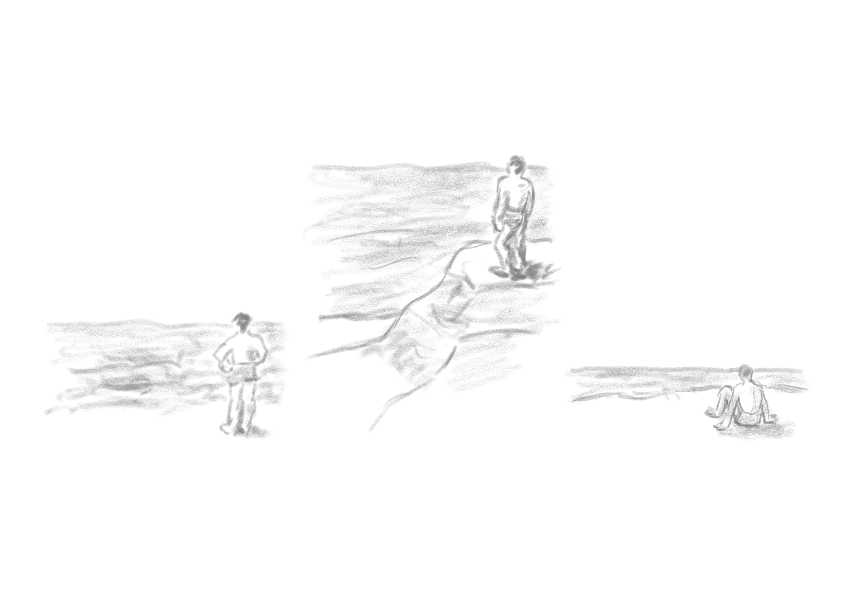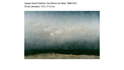 Da die Augen der Rückenfigur auf der Horizontlinie liegen, befindet man sich als Betrachter auf derselben Höhe. Es lässt sich aber keine konkrete Position erkennen, man könnte in der Luft schwebend die Situation betrachten oder sich auch eine ähnliche Erhebung als Standort vorstellen. Jedenfalls wird man einer etwas ungeklärten Postion zugewiesen, was entsprechend als eine Wirkung empfunden werden kann: distanziert, unsicher, schwebend ...