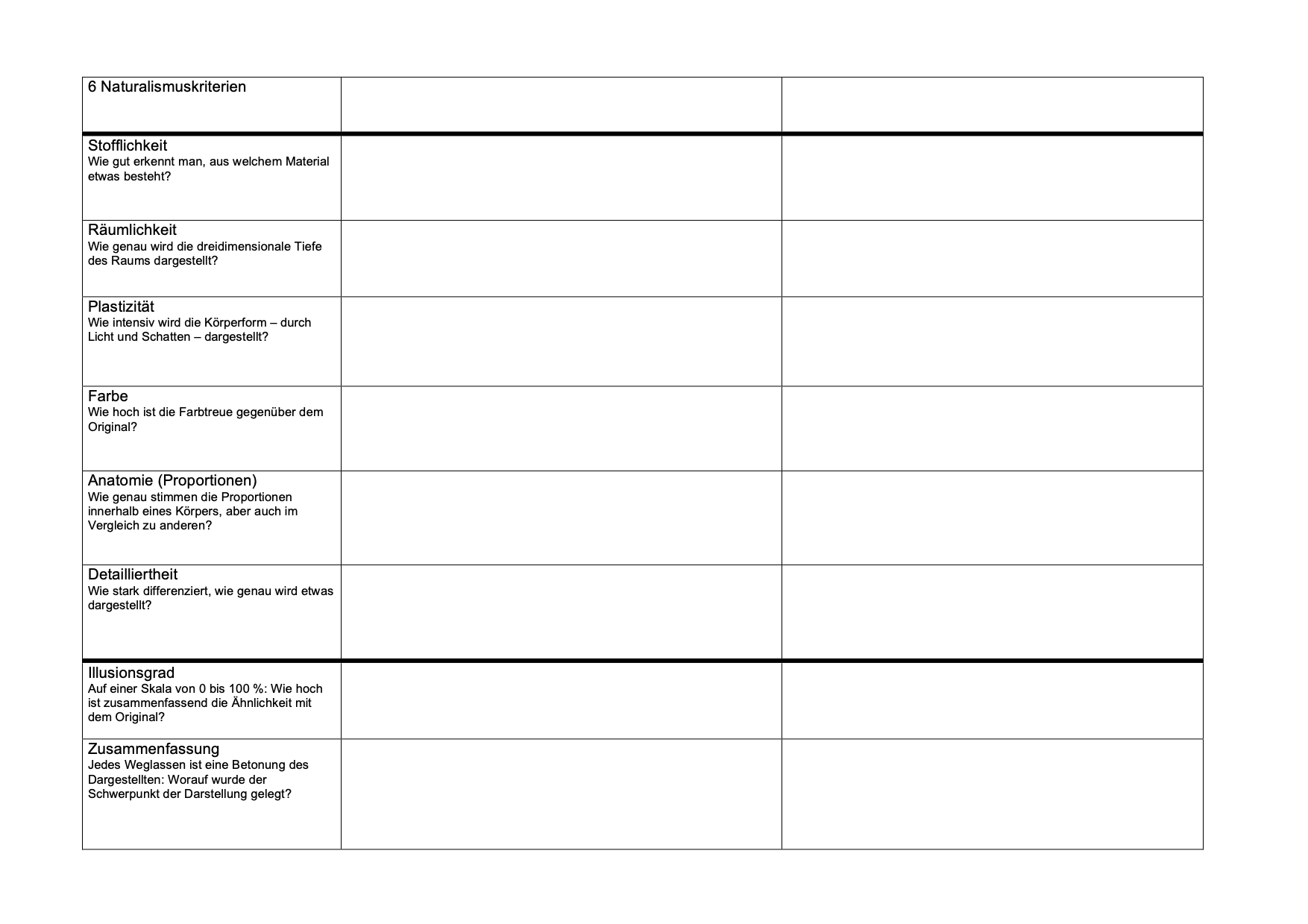 Nicht alle hier aufgeführten Aspekte sind bei jedem Medium sinnvoll, hier wird von gegenständlicher Malerei (Porträt, Landschaft ...) ausgegangen. So lassen sich bildnerische Entscheidungen direkt mit der sichtbaren Realität vergleichen und verdeutlichen.