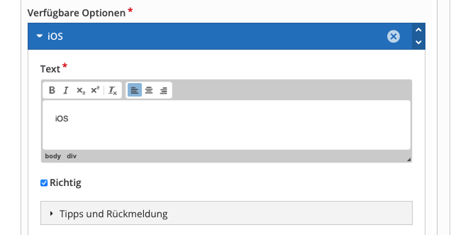 Jetzt werden mehrere Antwortmöglichkeiten formuliert, wobei angeklickt wird, ob es sich um eine richtige Antwort handelt.