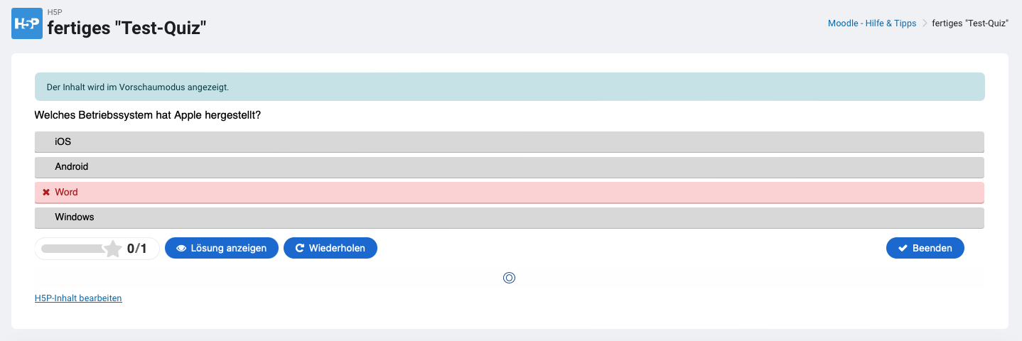 Es erscheint sofort in der Ansicht, in der es der Schüler sehen wird. Man kann es sofort ausprobieren, es findet keine Speicherung der Antwortversuche statt.