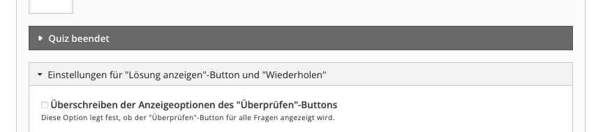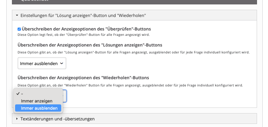 "Überprüfen", "Lösung anzeigen" und "Wiederholen" lassen sich einzeln für jede Frage deaktivieren, je nach didaktischer bzw. pädagogischer Vorstellung der Lehrkraft.