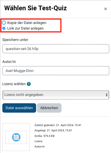 Dann muss entschieden werden, ob man das H5P-Modul nur verlinken oder als Kopie nutzen möchte.