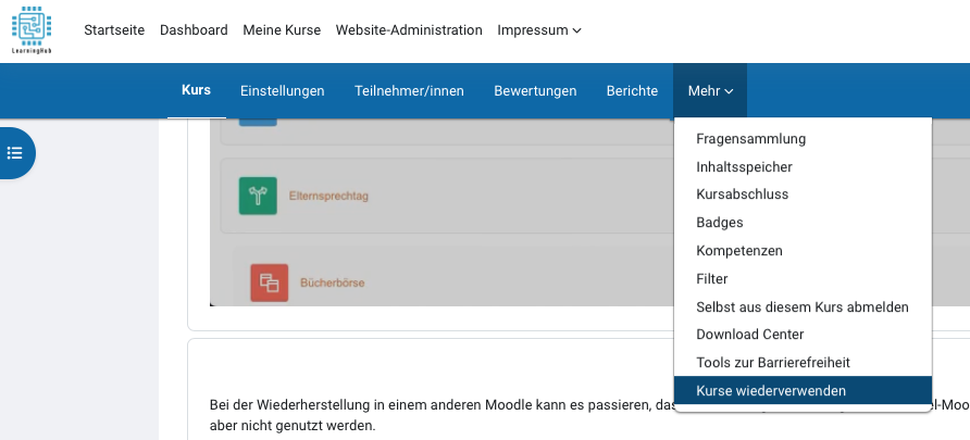 Man wählt dort "Kurse wiederverwenden" und anschließend "Sicherung".