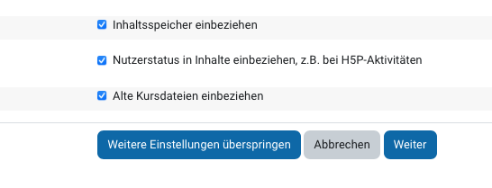 Nach einem Import können einzelne Aktivitäten gelöscht oder als unsichtbar für Schüler*innen eingestellt werden. Dieses Verfahren würde ich empfehlen, statt direkt beim Import einzelne Aktivitäten oder Materialien auszuschließen.